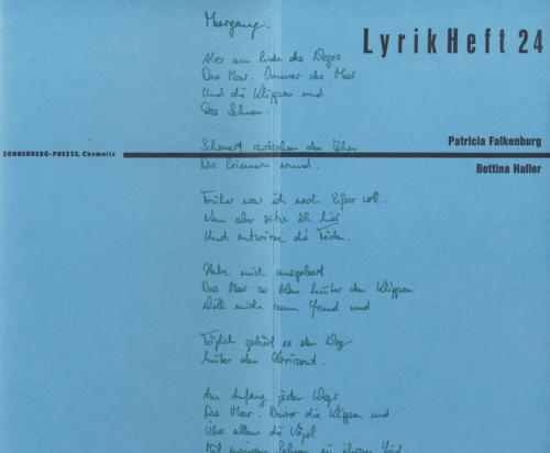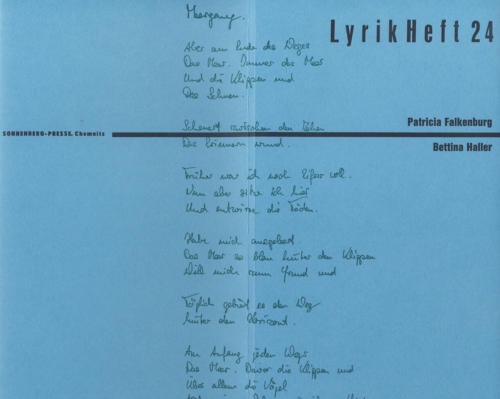 in Das flüchtige Schöne einfangen auf „Das Gedicht“, Hrsg. Sandra Blume: „Blaue Pause.“